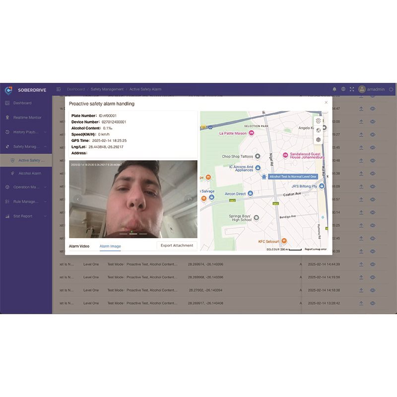 The SoberDrive portal provides secure, realtime access to critical driver safety data, including detailed breathalyser test